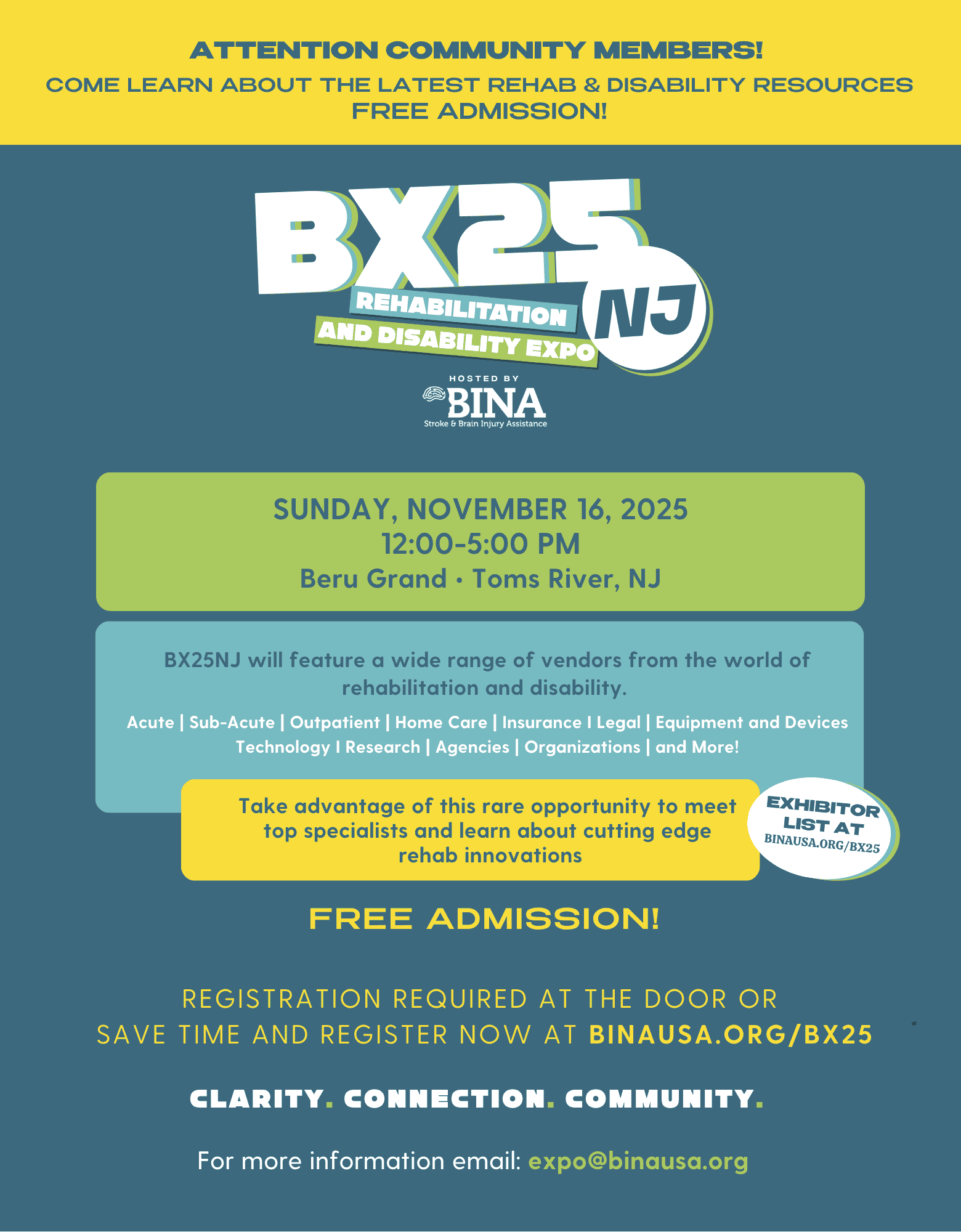 View GalleryThe BX25NJ Rehabilitation and Disability Expo, hosted by BINA, took place on Sunday, November 16th at the Beru Grand in Toms River, New Jersey. Hundreds of people attended, eager to learn about the latest advances and cutting edge innovations in the world of rehab from leading specialists and professionals. Exhibitors represented a broad and comprehensive range of top pediatric and adult rehab facilities, therapy centers, providers, companies, agencies and organizations. Individuals with disabilities, family members and professionals took advantage of every possible opportunity to learn from and converse directly with physicians, therapists, facility representatives, lawyers, insurance experts and experts in communication and technology.